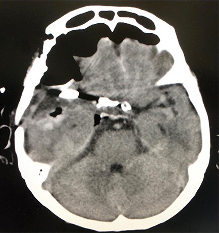 大型の破裂動脈瘤に対し開頭クリッピング術を施行。脳梗塞等合併症が起こる事なく退院されています。術前CTで認められるくも膜下出血は術後に反対側や、後頭蓋窩まできれいに洗浄除去されています。
